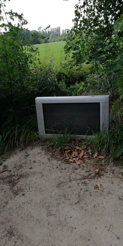Aan de kant van de zandweg. Een ‘knots’ van een tv-toestel. Gedumpt. Best wel zielig gedoe. Weg-is-weg. ‘Lang leve de natuur’.