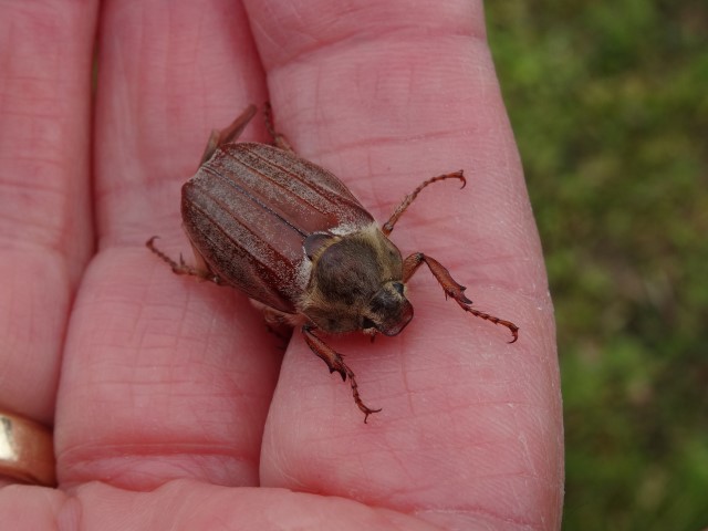 Wij stonden naar de meikever in mijn hand stonden te kijken, toen er net een paar voetgangers voorbij kwamen. Zij hadden onderweg ook al een kever gezien, zeiden ze.