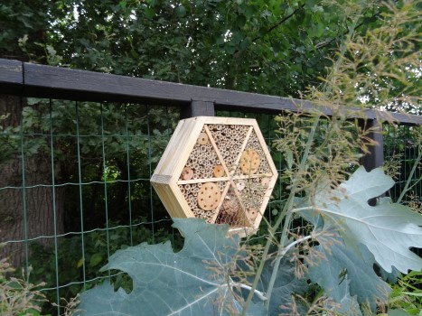 De eekhoorn trippelde snel over de rand van de omheining, deed met een voorpootje het (houten) dekseltje van het voederhuisje omhoog, haalde er iets uit – we konden niet zien wat -, ging daarna vlug verder, klom op het afdakje van de buren, keek rond, keerde zich om en verdween, via dezelfde rand terug, tussen het groen van de grote eik die vlak naast de omheining staat.