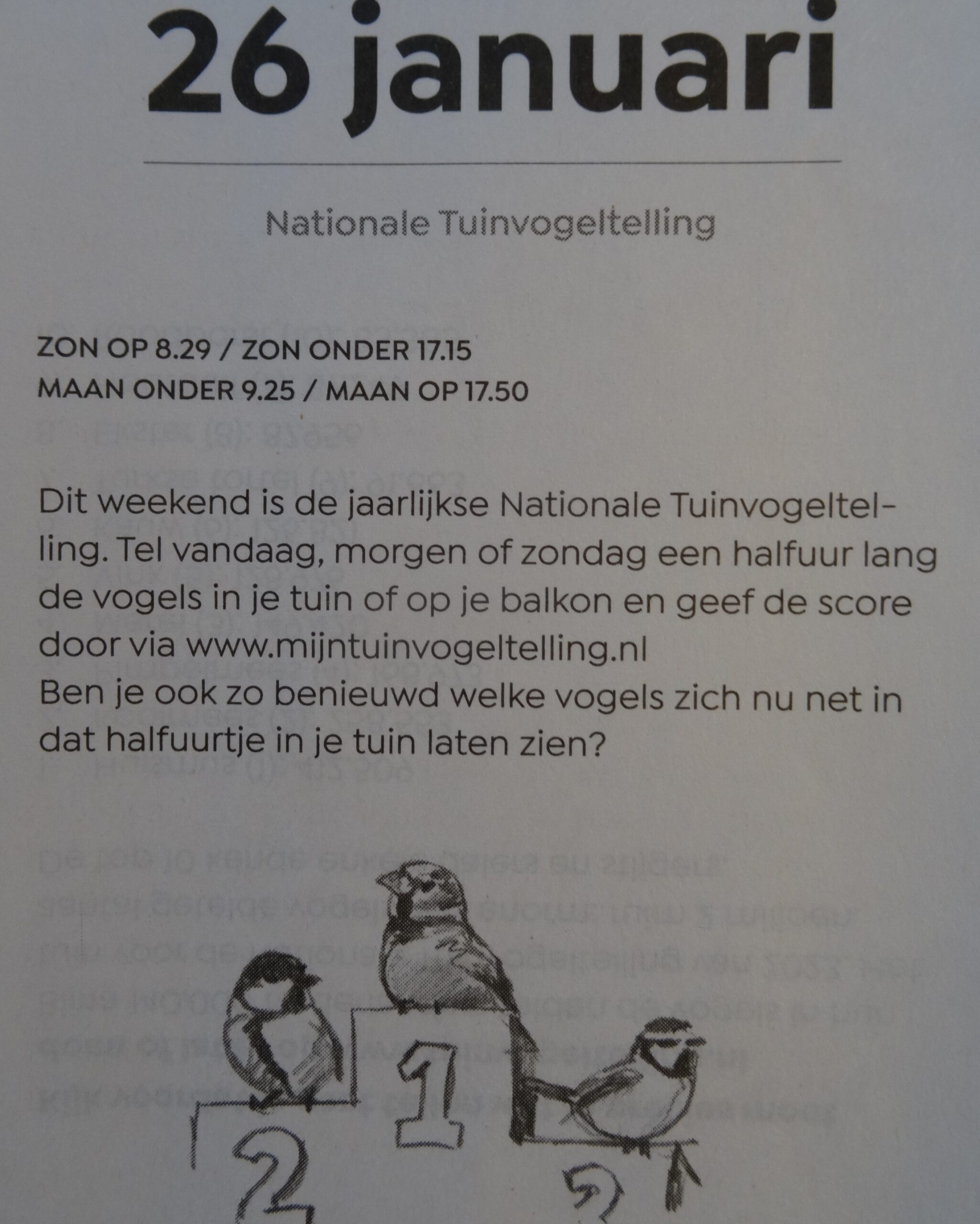 Het kon gisteren al, maar vandaag of morgen (zondag) kan het ook nog, d.w.z. de vogels in je tuin of op je balkon tellen.