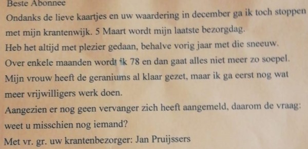 Het lag vanmorgen vroeg (!) op de deurmat Geplaatst op 17.02.2022 door Martien Weer of geen wind! En bijna 78 jaar! Petje af! Ik doe het hem niet na! Maar wie kan deze man wel helpen!?