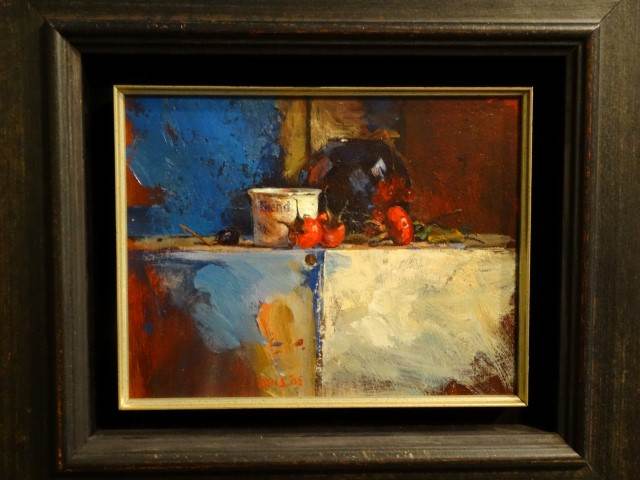 We waren op de etage met de expositie van het Drents Schilders Genootschap in ‘Warenhuis Vanderveen’ in Assen. Daar zagen we het schilderijtje weer. Dat dachten wij tenminste. Het stilleven was geschilderd op acrylpapier (op paneel) en het had een andere lijst.