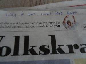 Toen we weer ‘thuis’ kwamen, lag de krant op de deurmat. Hij had zich dus aan zijn woord gehouden. En werkelijk, hij had er ook iets op geschreven:
