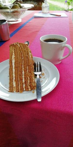 Het stukje taart, dat ik daar kreeg voorgeschoteld, smaakte geweldig goed. (De in laag-op-laag gemaakte taart is tussen de lagen gevuld met een honingcrêmebeslag en bestrooid met stukjes walnoot, las ik ergens op internet.)