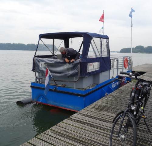 Het pontje bij Deventer was zo vol met passanten dat wij met de fietsen niet mee konden. Dus even wachten de volgende pont!