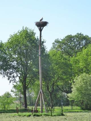 – Toen we door het bijzonder mooie natuurgebied ten oosten van de stad reden, zagen we een aantal dode bomen – een kennis zou zeggen “slordige” bomen – in het landschap staan. In Taarlo hebben wij een poosje gekeken naar de ooievaar op zijn, of haar, hoge nest. Af en toe zagen we de kop van het jong. Het was een prachtig gezicht.