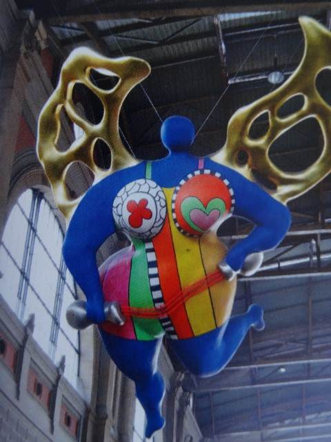 De kunstenares was bijvoorbeeld de maakster van de kolossale Nana’s, de kleurrijke vrouwen. Haar creatie, de vrolijk ogende ‘Nana Engel’, hebben wij aan het plafond van het station in Zurich zien hangen.