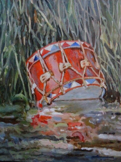 Naar het origineel van Rein Pol: “Trommel tussen het riet met voorstudie dobberend en trommel tussen ijsschotsen” geschilderd (afmeting:18×21,5cm)